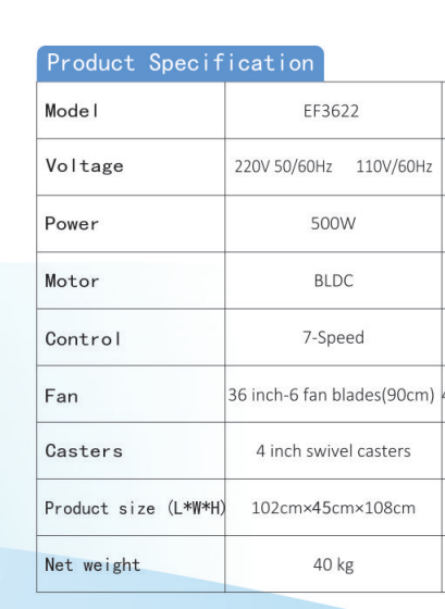Especificaciones para Ventilador industrial portatil redondo 500W 110V RGC